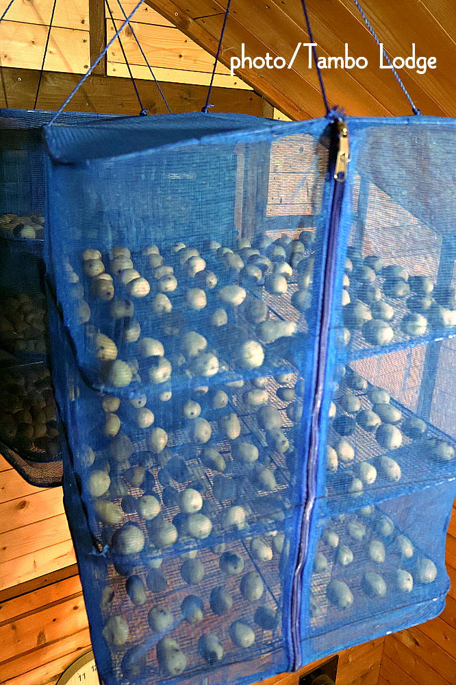 そして無事Tambo Lodgeに到着。木の葉とか少しの汚れを洗い落としてから、ホームセンターで売っている3段の干物を干す網にチューニョを並べ、今回はTambo Lodgeのペレットストーブが燃えるその上の天井に吊り下げて乾かします。