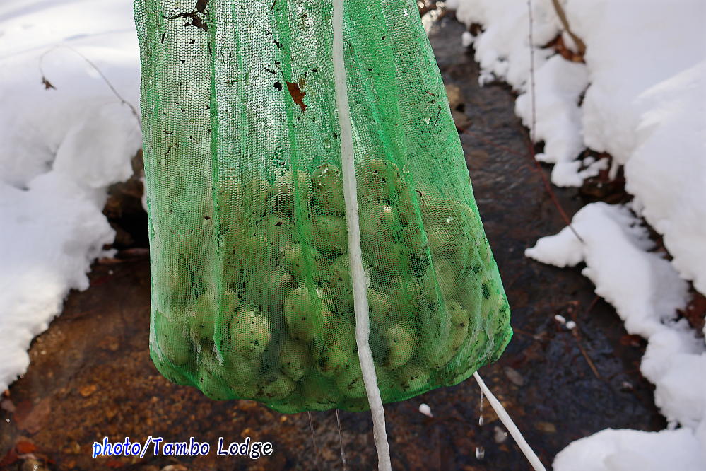 昨年の12月26日、大雪が降る予報だったので、急いでタンボ・ロッジの裏の川の清流に、「水晒し」をし始めた「白チューニョ」。