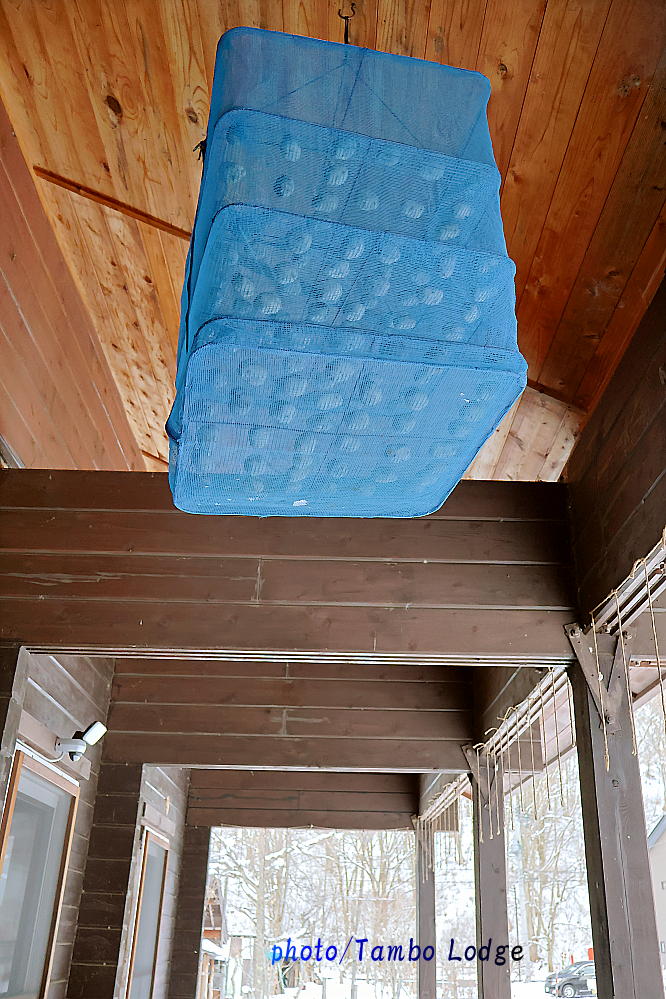 ホームセンターで売っている3段の干物を干す網にチューニョを並べ、軒下の陰の場所で陰干しに入ります。